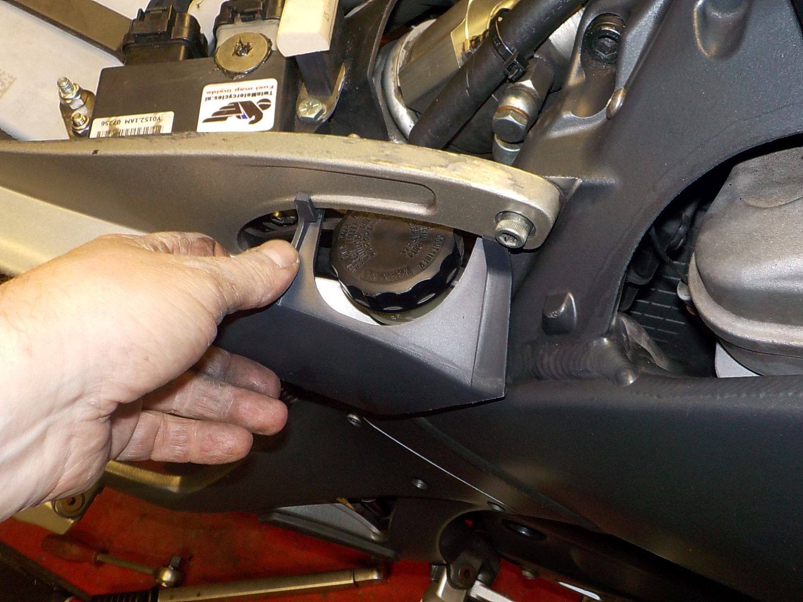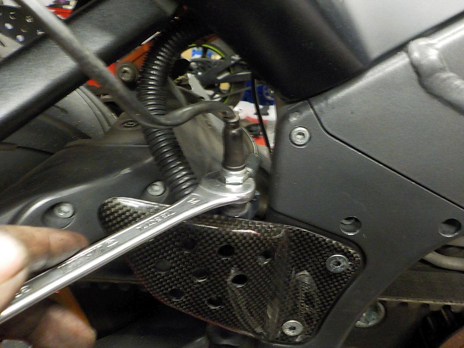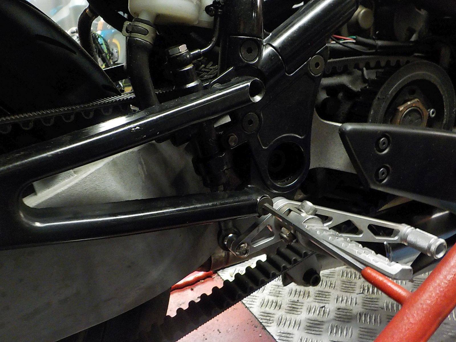 passenger peg bracket removed, and carefull take the c-clip on the master cylinder to remove the pushrod — bij Twin Motorcycles Buell Support forever.