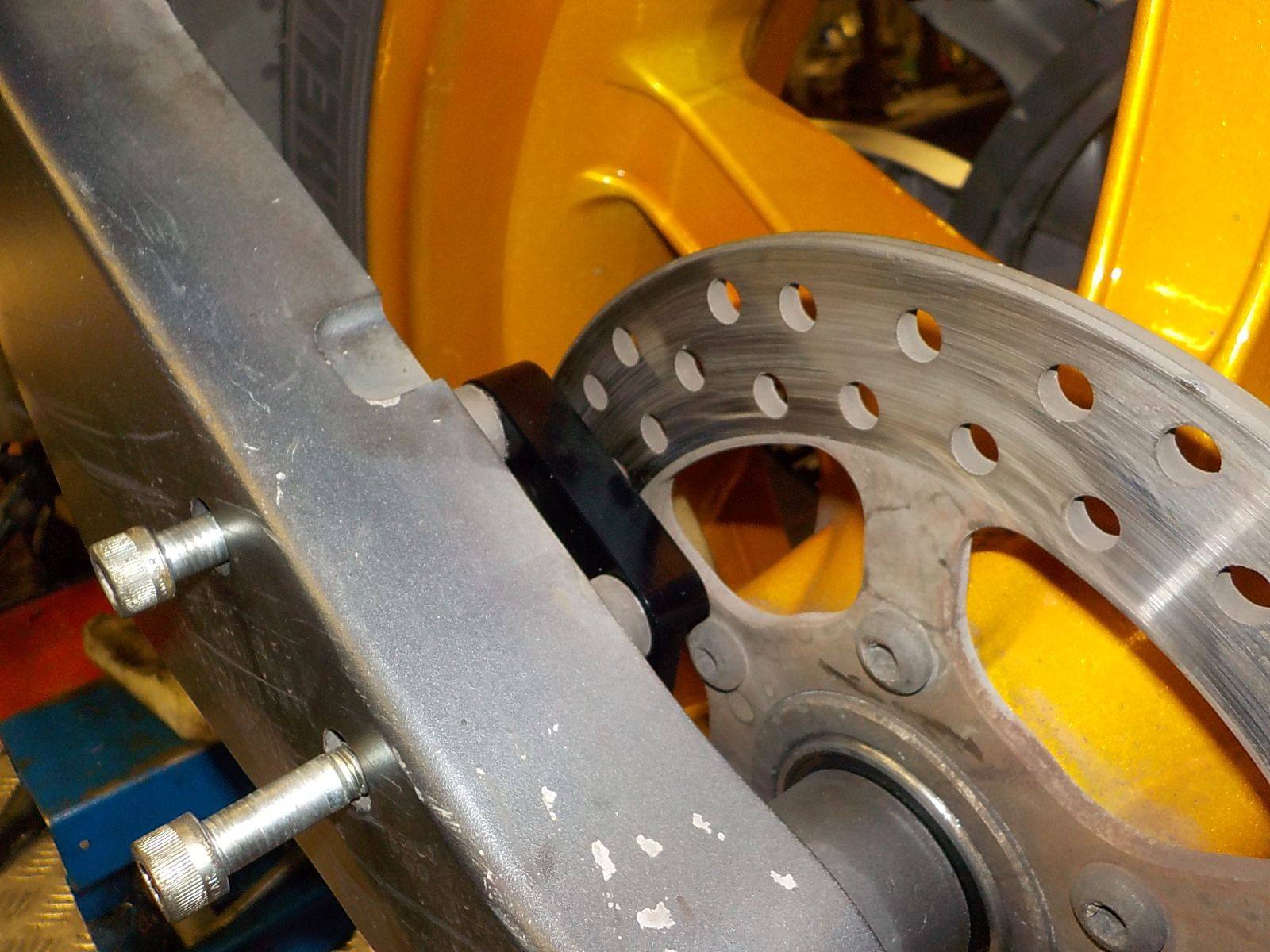 and swing arm axle out a little so the swing arm can be tilted a little to the side — bij Twin Motorcycles Buell Support forever.