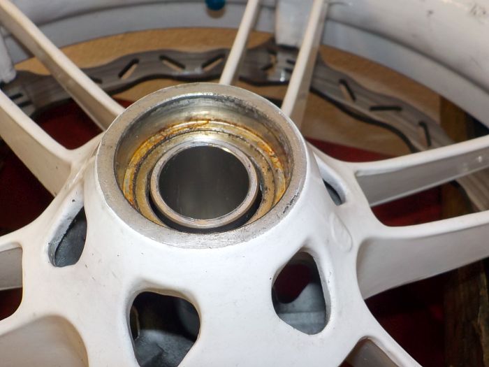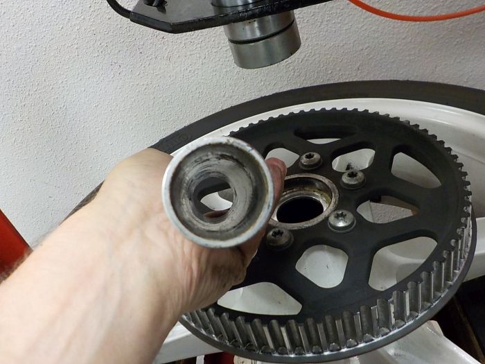 We now turn the wheel around , leaving the press tool in the wheel to support the inner and outer bearing race, and put the wheel spacer in , sometimes you can see on the spacer ends the inner race inpressions