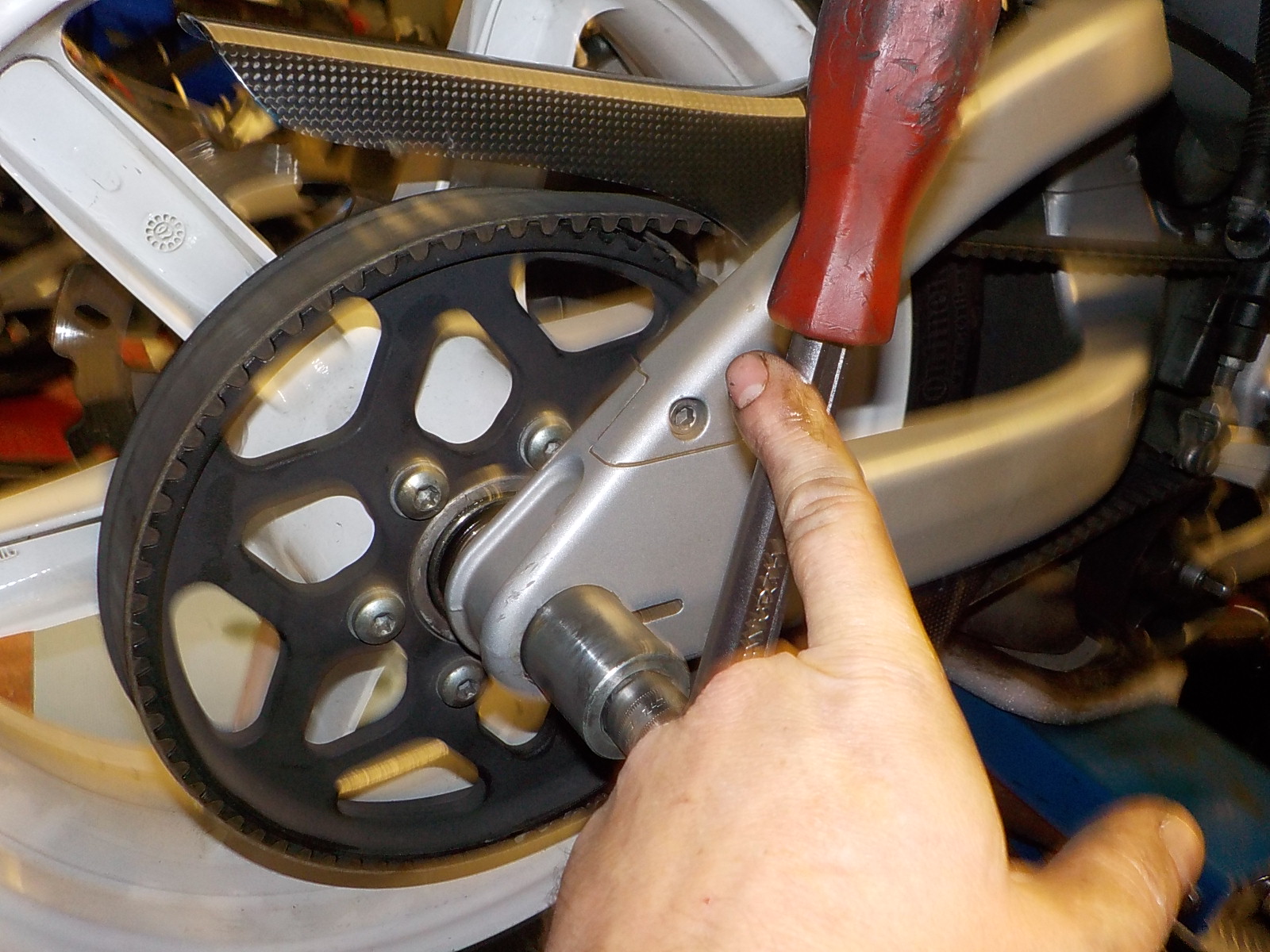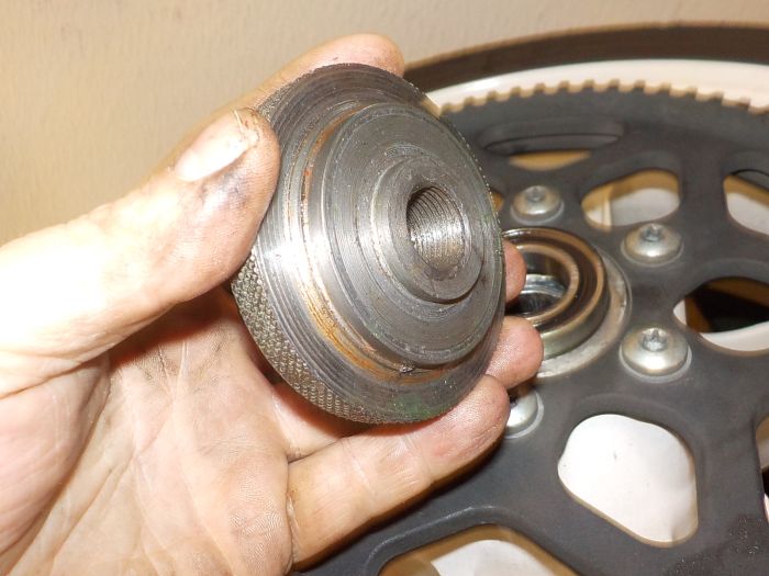 you see here the puller that is mounted in the disk side, and i'm pressing the bearing out from the other side with a large extention tool
