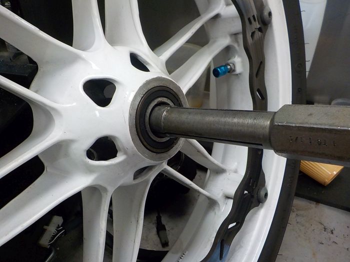 To remove the bearings, and support plates to press the bearings back in. So we begin here with a rear wheel bearings that feels bad