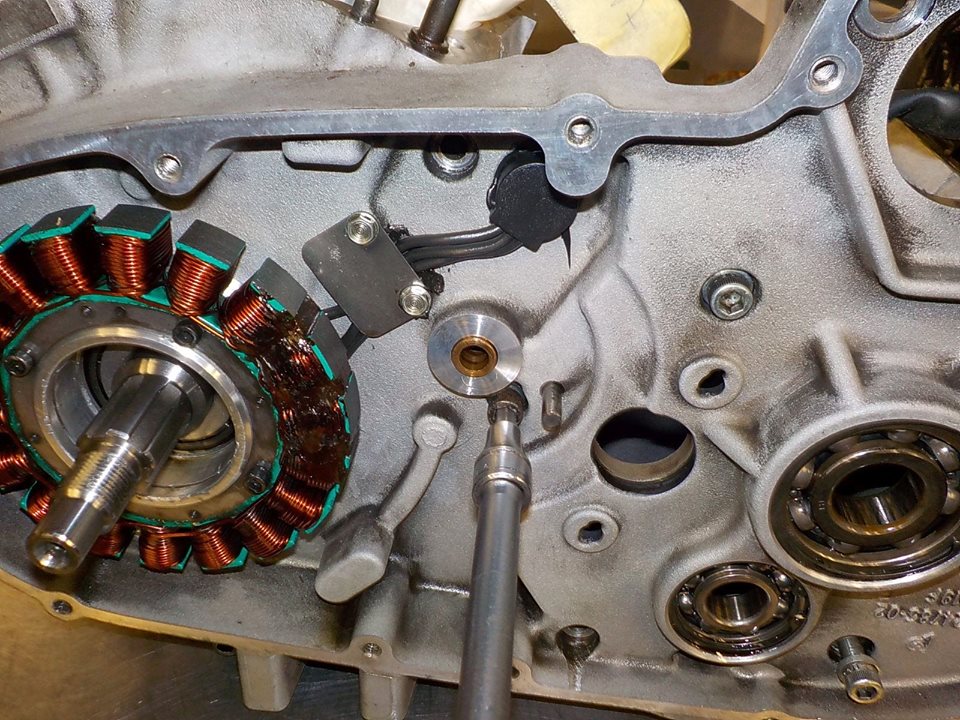 prepping right side case, detent arm holding pin — bij Twin Motorcycles Buell Support forever.