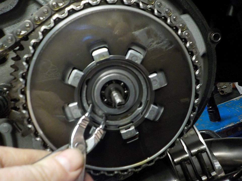 clutch pulling plate out, to get to the main shaft nut