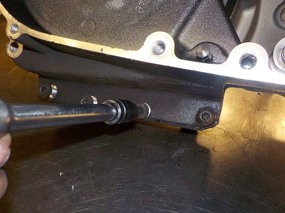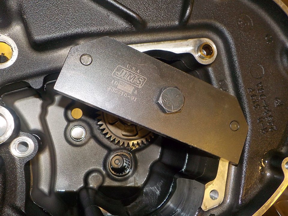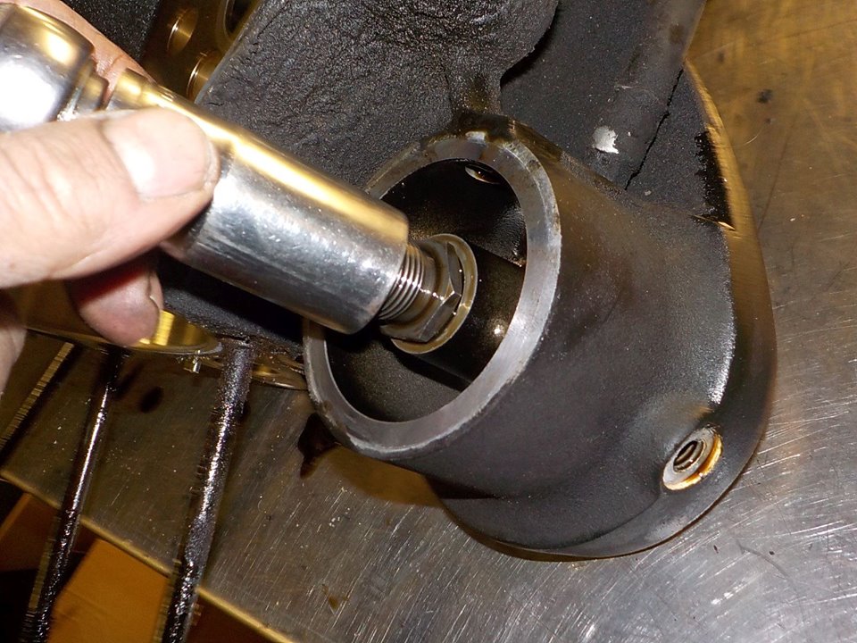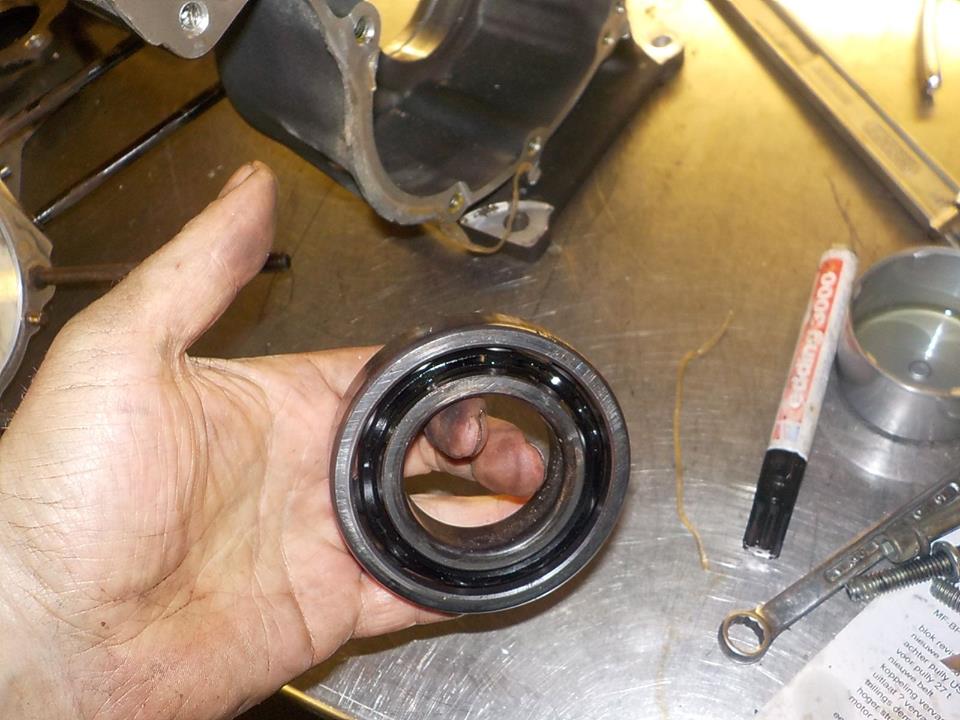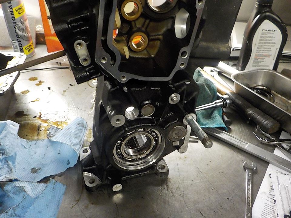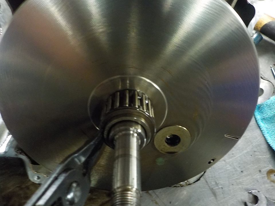 i put the crank bearing mounting tool with some spacers on the sprocket shaft so the heavy fly wheel will not drop out when the bearing is loose