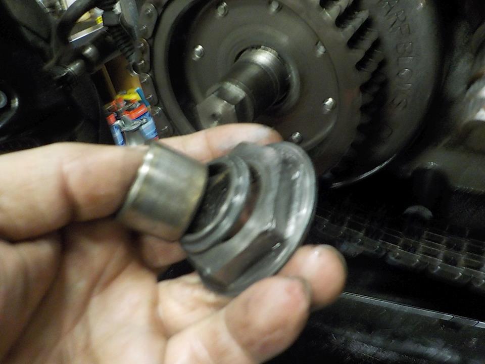 needed to borrow a socket... no normal size for us , a small race is pressed on the crank tap , and the crank tap is welded on the original crank.. and put on the lathe and cut threads — bij Twin Motorcycles Buell Support forever.