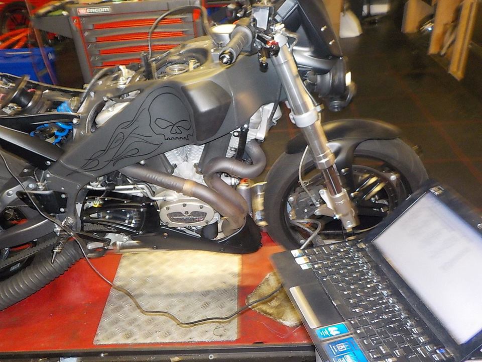 and back on the dyno, prepped and ready .. wide bands O2 sensors front and rear.. to run here in furhter and dyno tune the bike