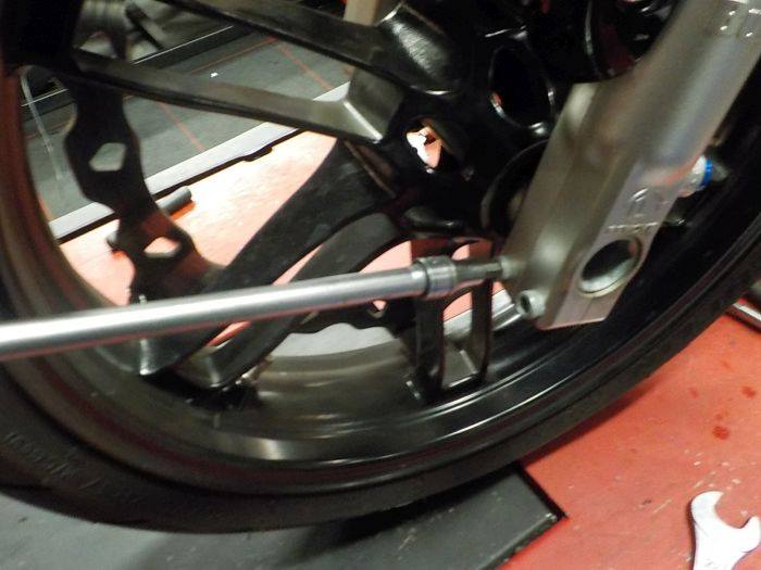 wheel in, first put the swingarm brace in , than tighen the rear axle.. and fasten the pinch bolt
