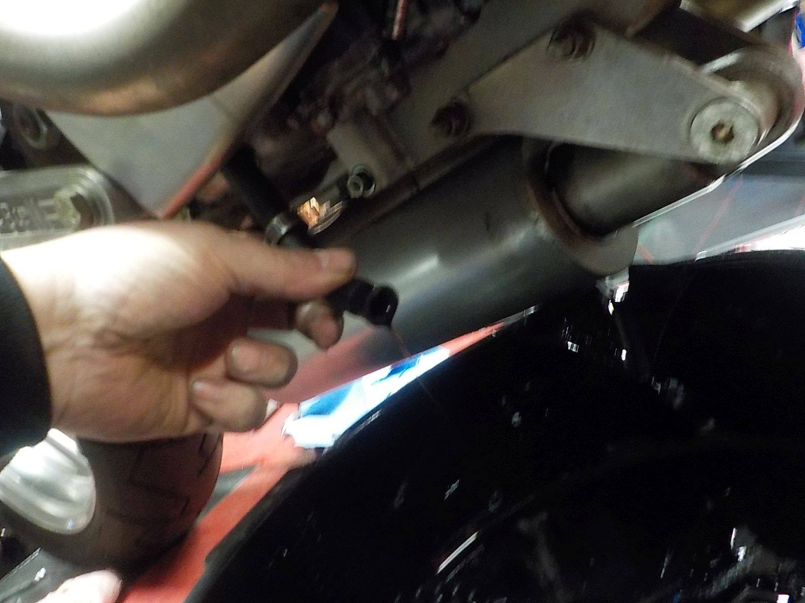 oil tank drain plug... over the swingarm. and close to the tyre — bij Twin Motorcycles Buell Support forever.