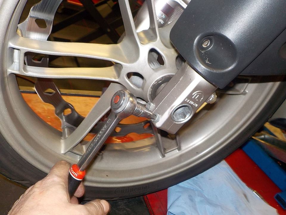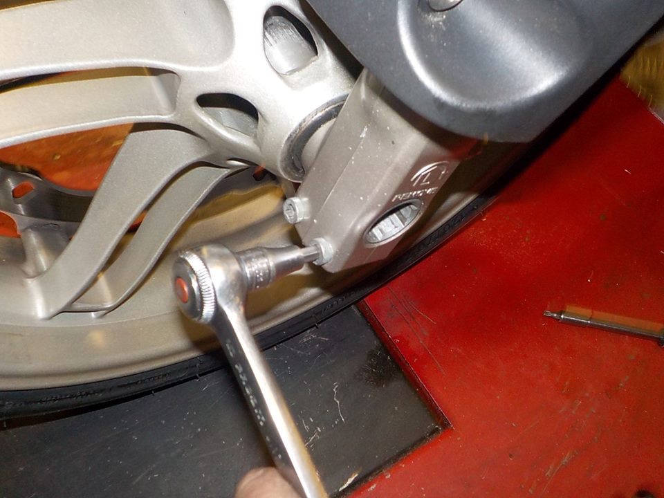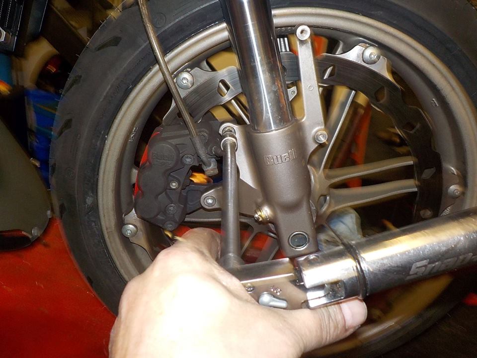 wheel axle out and wheel free to remove the caliper— bij Twin Motorcycles Buell Support forever.