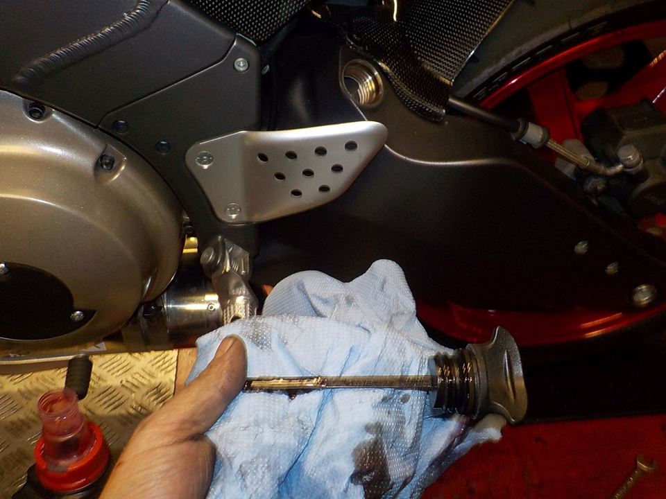 warming up and setting oil level.. tube frame models... mesure straight up and keep the level 1/2-3/4 from max .. test ride