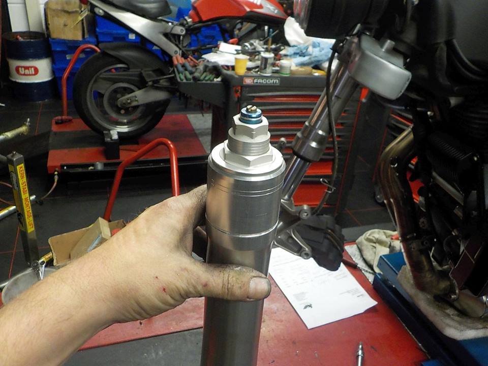 pressing down the front suspention a few time to set the forks on the axle — bij Twin Motorcycles Buell Support forever.