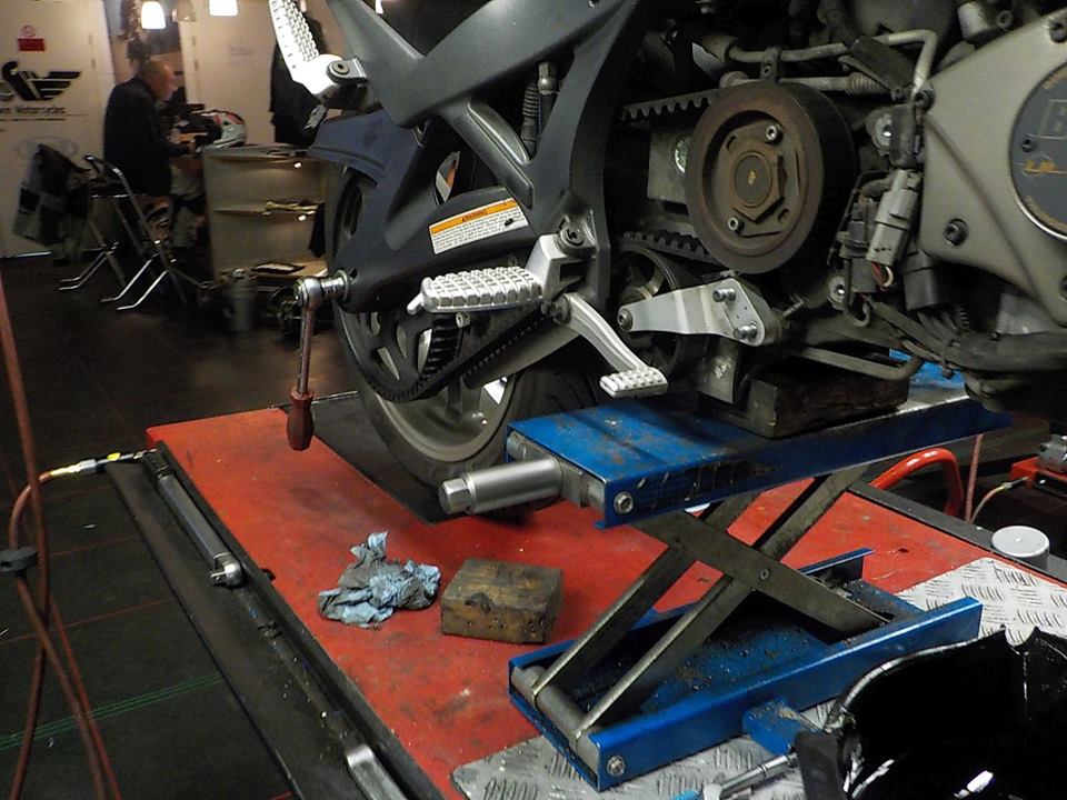bike in a hoist to lift the rear.. pinch bolt swingarm axle loose — bij Twin Motorcycles Buell Support forever.