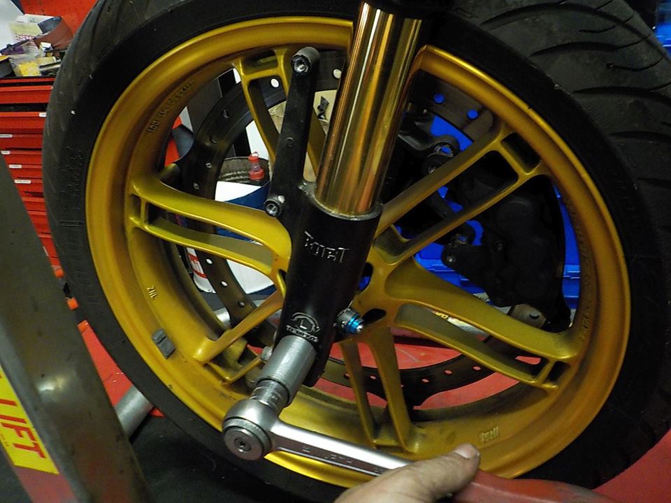 now the front end feels a lottle better, setting the front axle — bij Twin Motorcycles Buell Support forever.