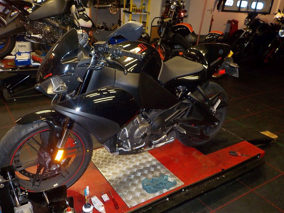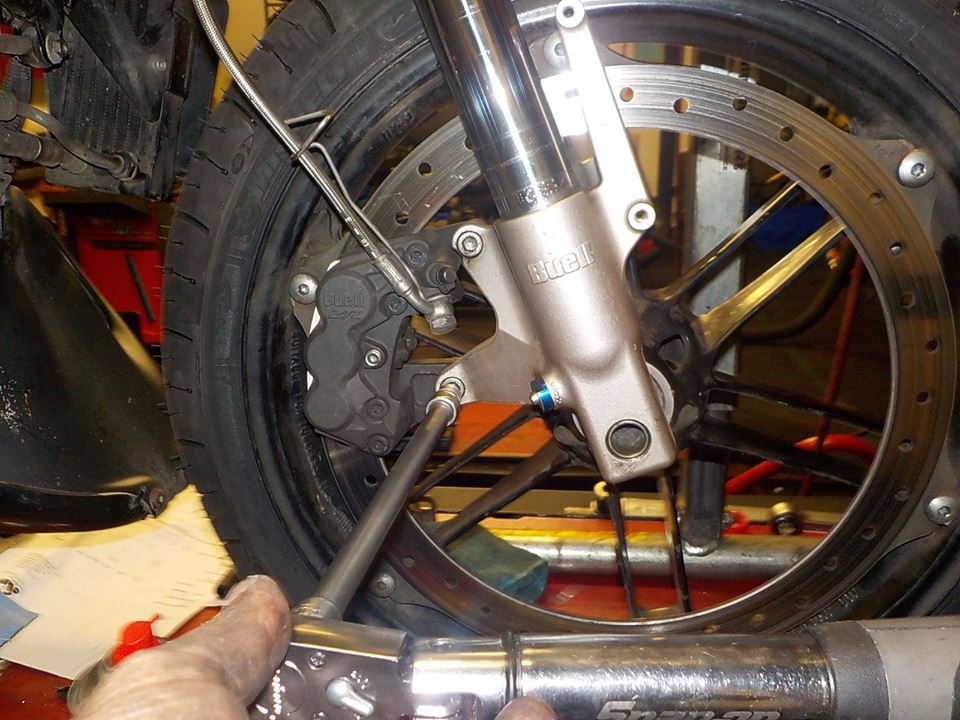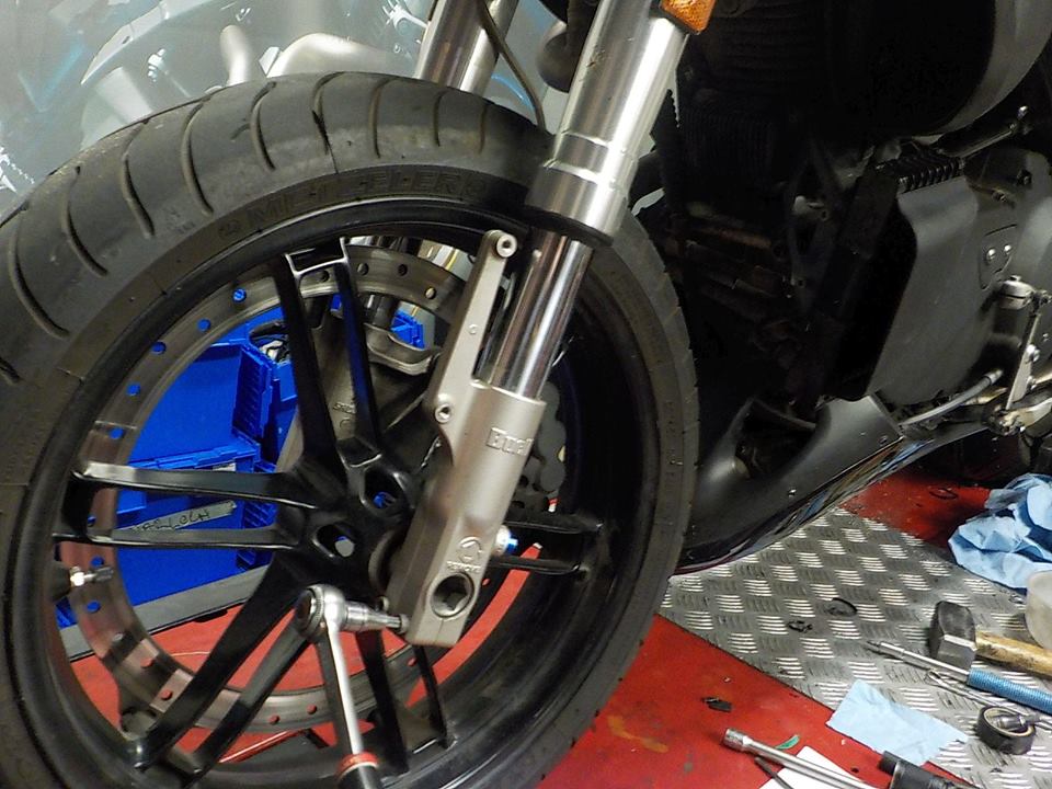 and pushing down the suspention to set the front forks — bij Twin Motorcycles Buell Support forever.