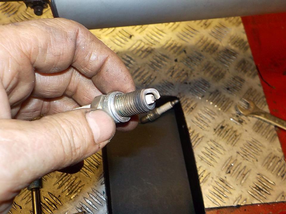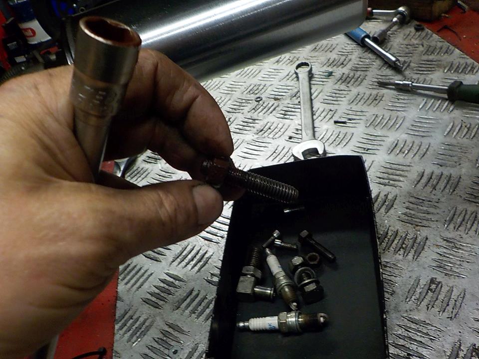 spark plugs out.. mnnn nice and white.. running way to lean — at Twin Motorcycles Buell Support forever.