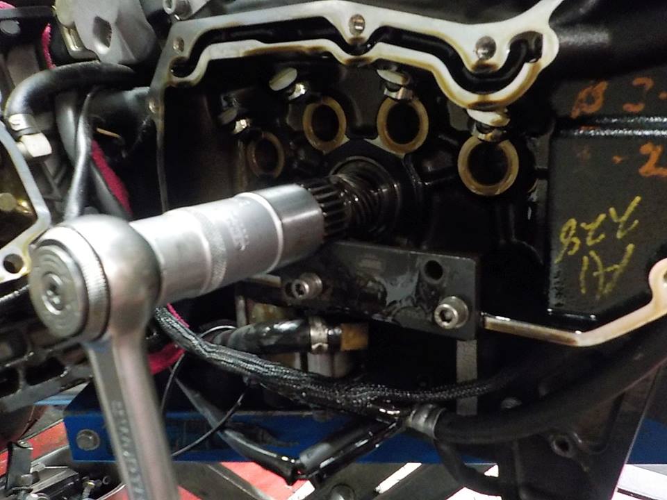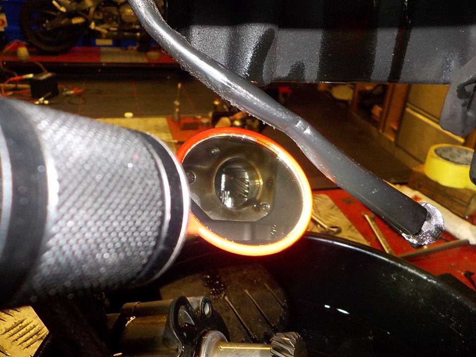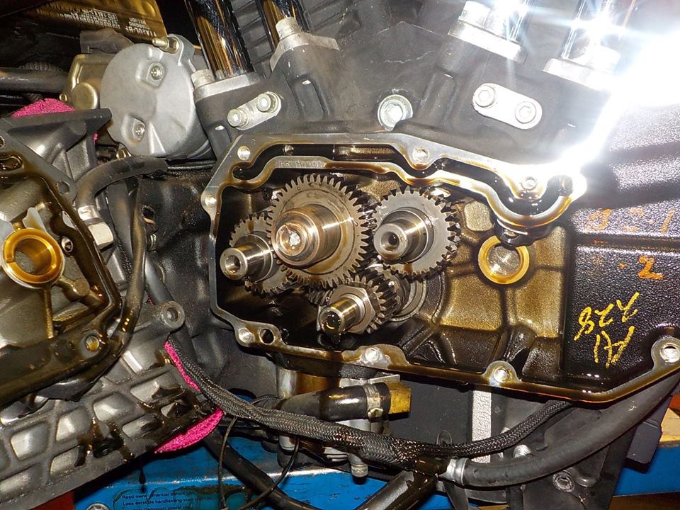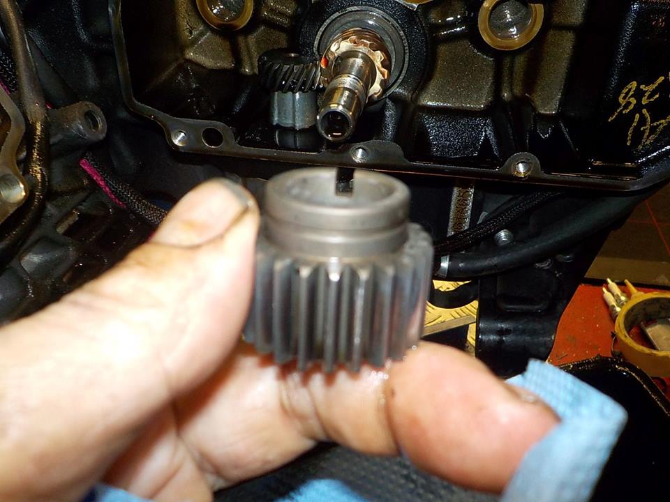 now with a mirror and light you can inspect the oil pump gear.. have the reas wheel lifted, bike in 5e gear so you can bump the engine around.. as you need to checl the gear on all places , this one has wear marks.. advice to change, but need to call the customer