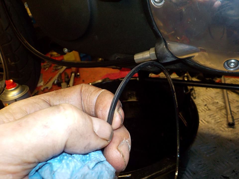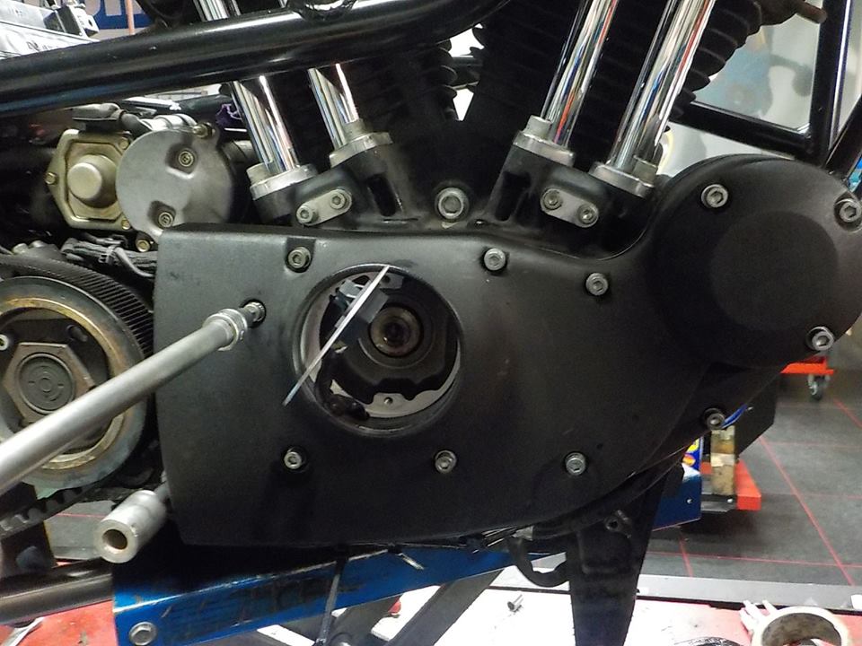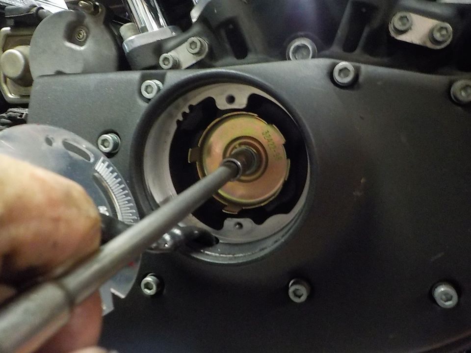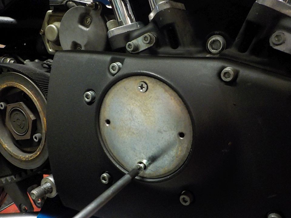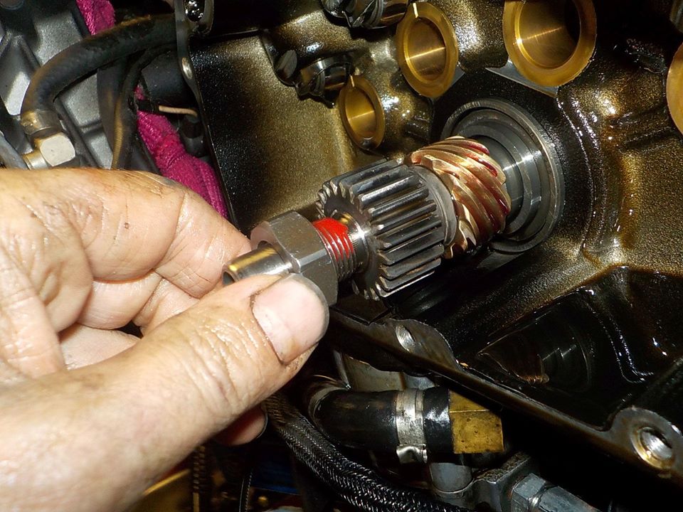 now with a mirror and light you can inspect the oil pump gear.. have the reas wheel lifted, bike in 5e gear so you can bump the engine around.. as you need to checl the gear on all places , this one has wear marks.. advice to change, but need to call the customer