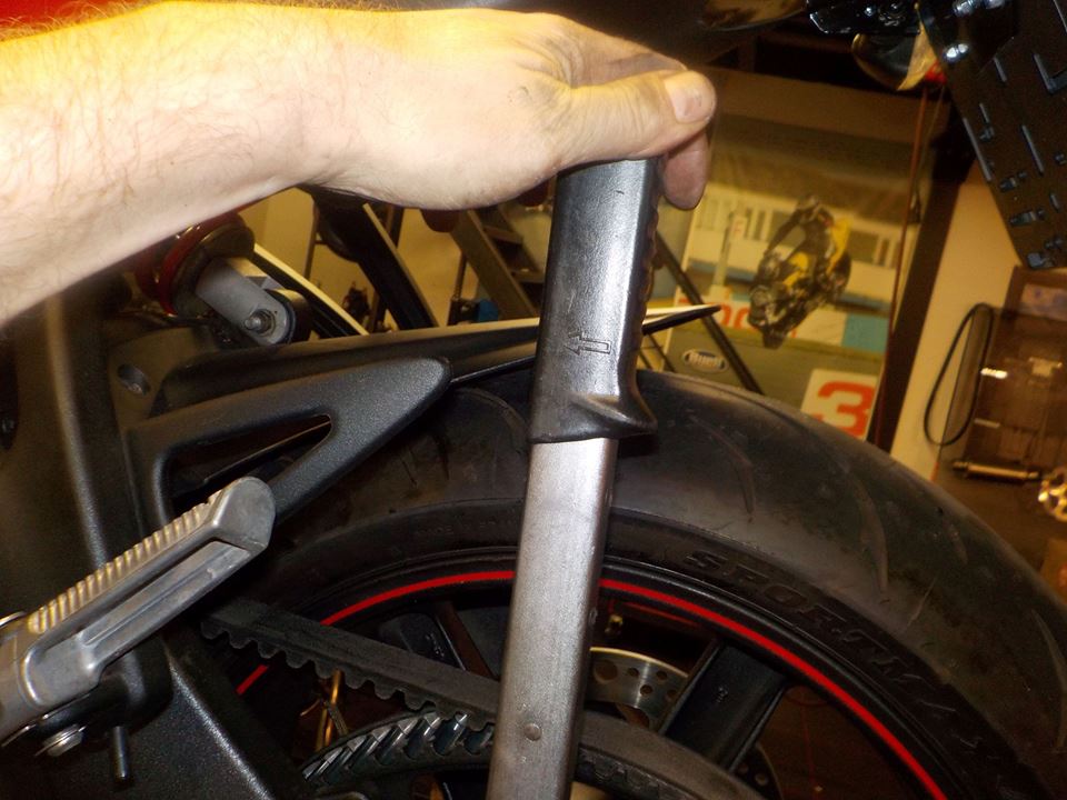 on with the service.. rear wheel check.. pich bolt loose size 10 mm —