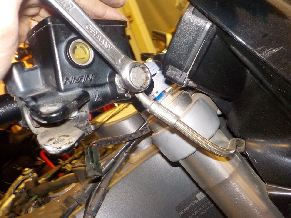 loose ever so slightly to turn the banjo a little ... can be done with out fluid leaking