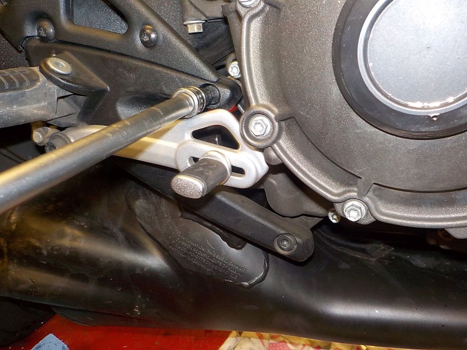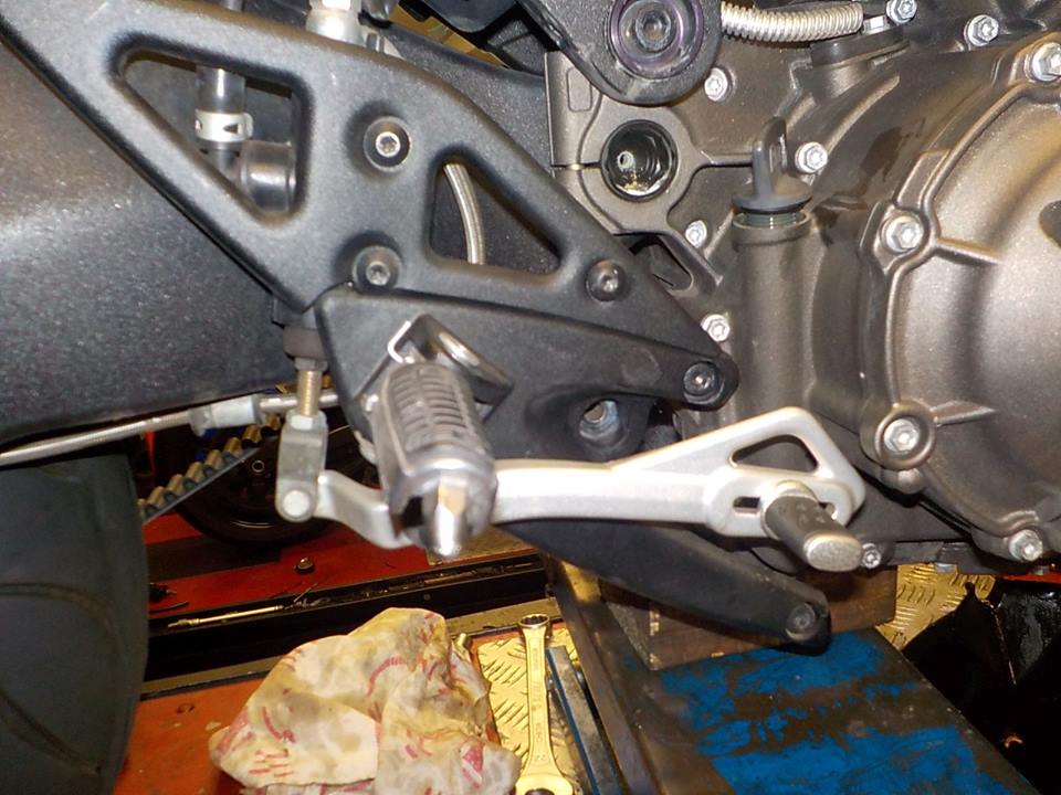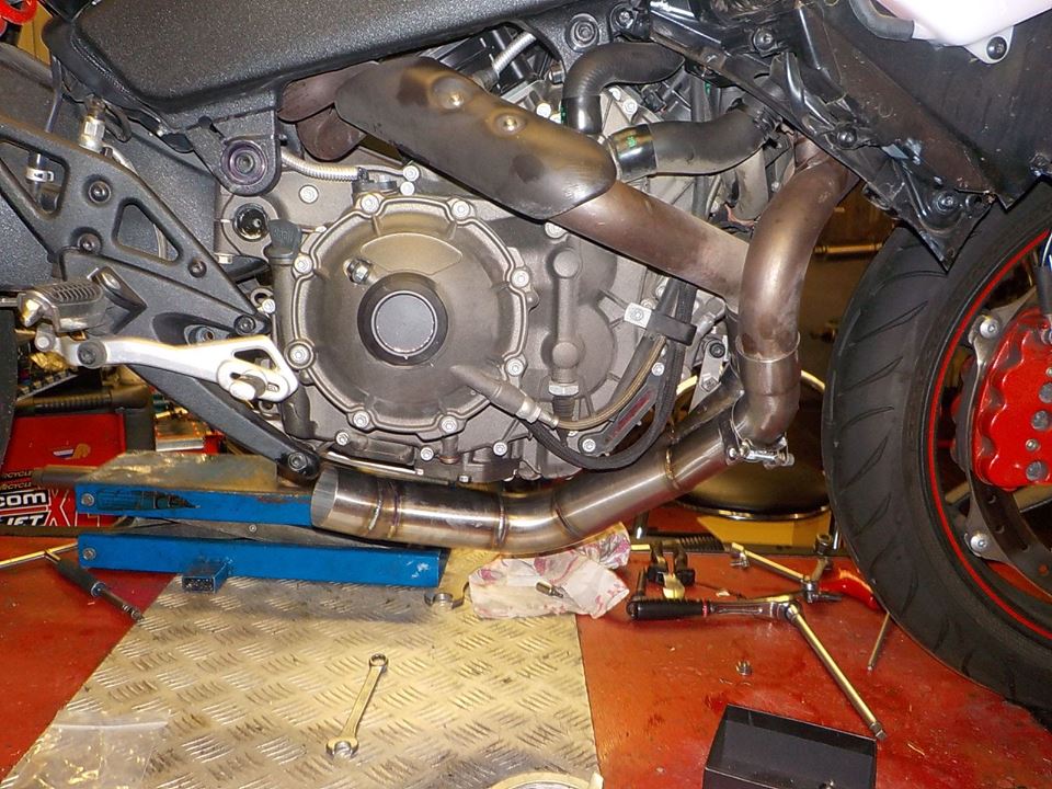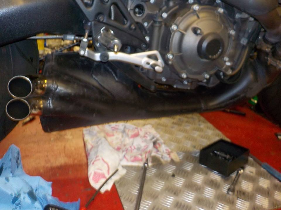 rear mounting loose, unscrew the foot pegs bolt and the exhaust comes down easier