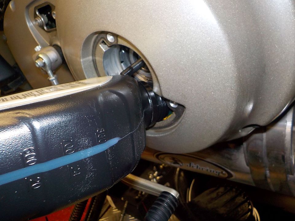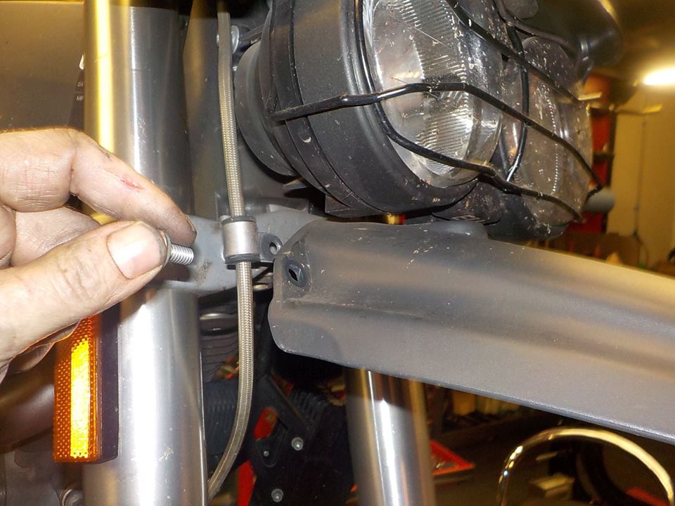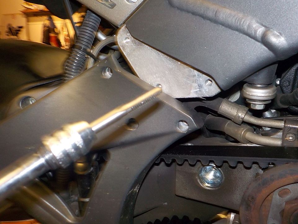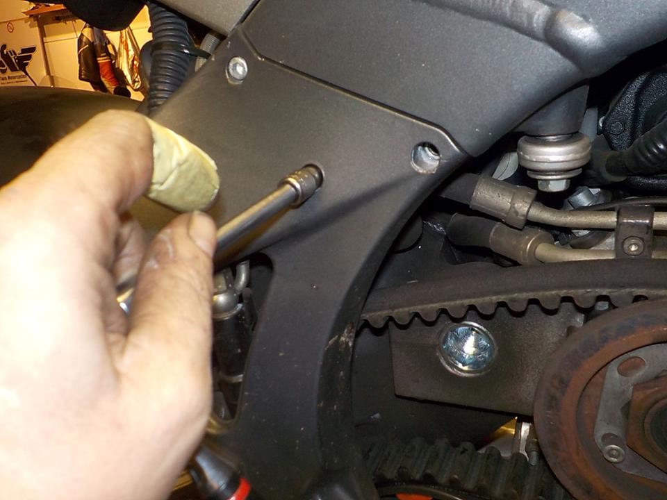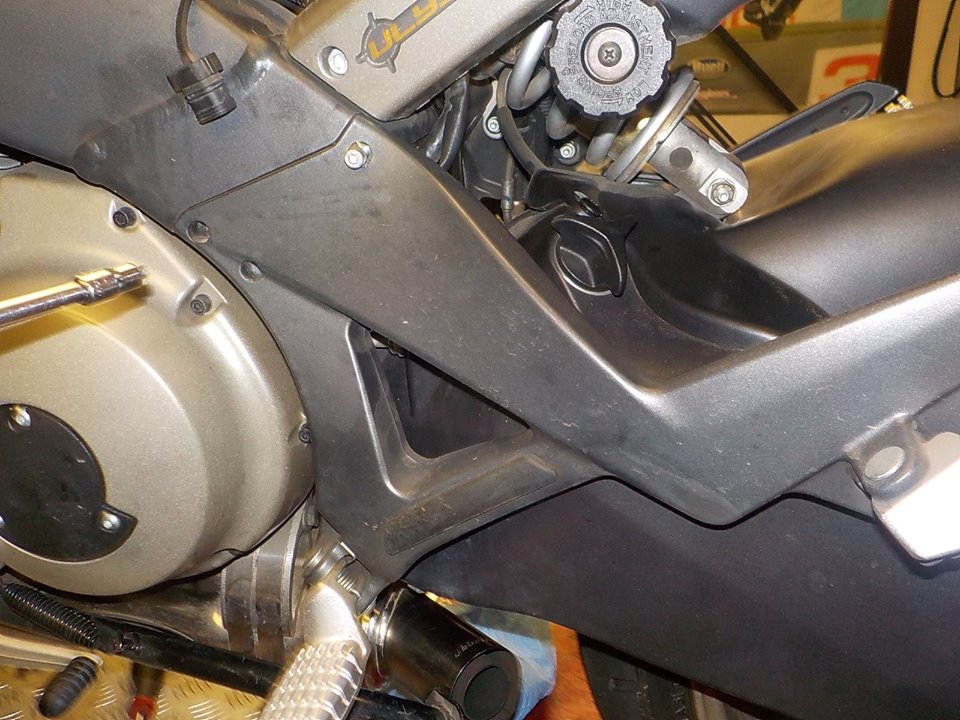 left foot peg bracket back on.. feed the fuel breather pipe in the slot