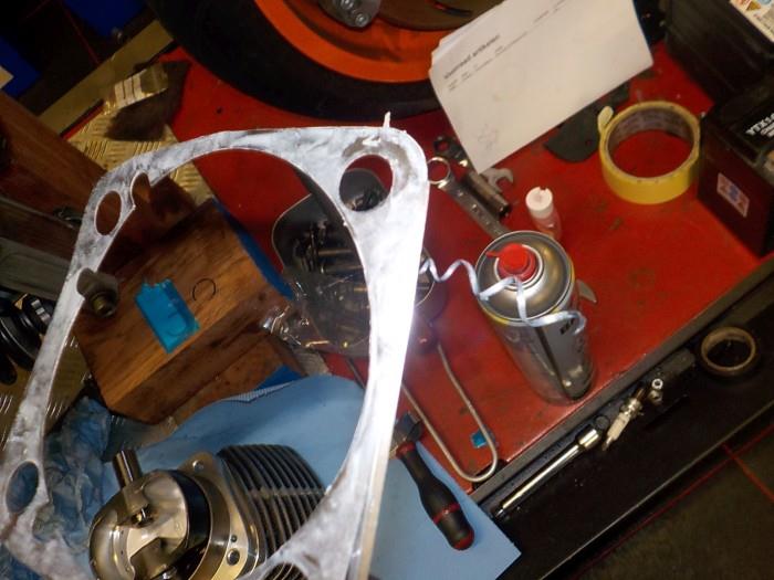 prepping the base gasket.. needs a sliver cut of to clear the pushrod cover base plates .. as there is very little gasket material..a little help from some sealer gasket