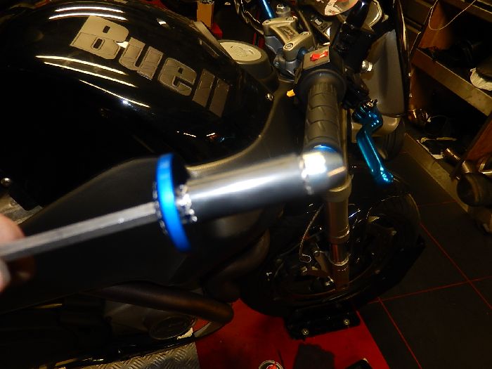 Buell XB12SS, rear tire change , bar end cap on.