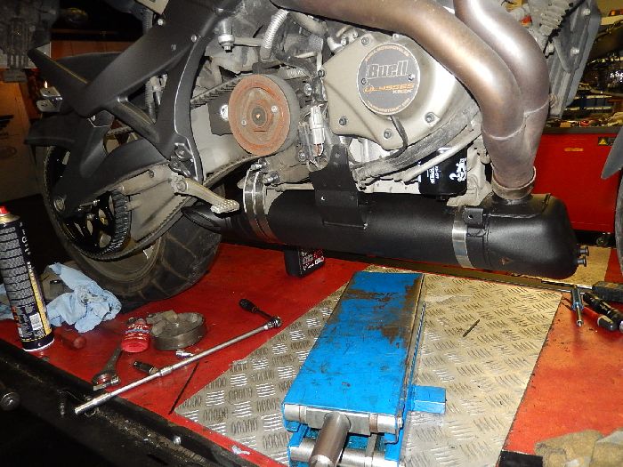 Buell Xb12S 2005, replace headers, belt tension off and remove the idler pulley to loosen the exhaust straps.