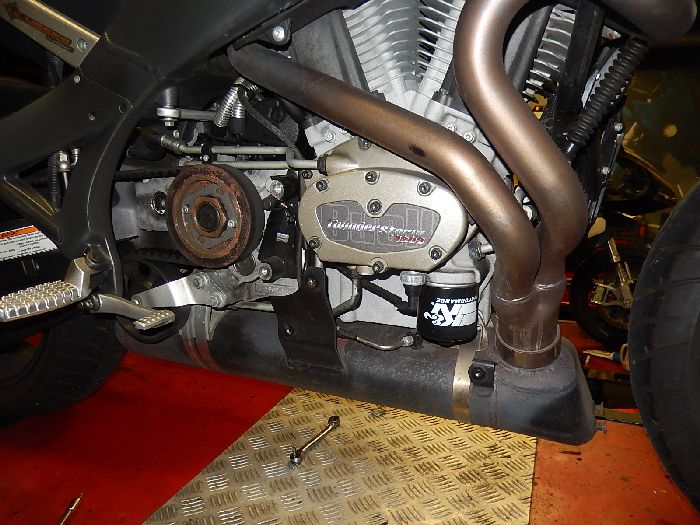 XB12XT 2008, hammer time, Chin spoiler and pulley cover off.