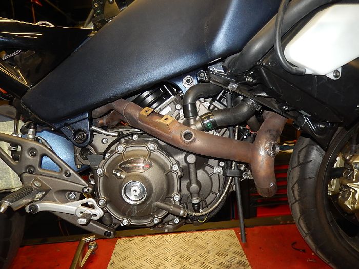 1125 testing new headers for fit form , now officialy the complete engine should come out to swap headers... but we have a work around solution, remove the rear brake caliper.
