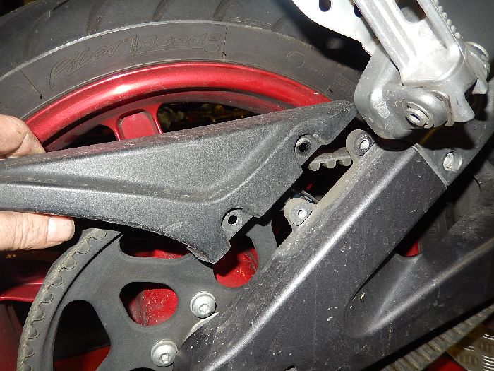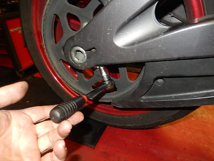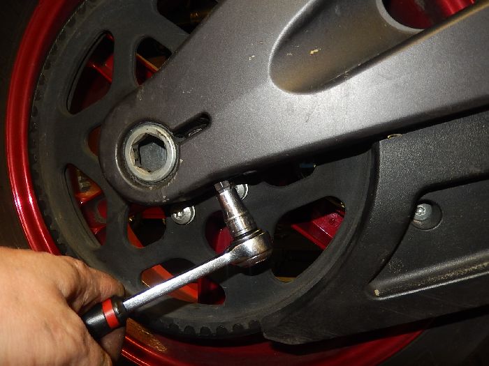 Now before you tighten the belt by turning the rear axle , first mount back the swing arm brace , tighten the screws to  34 NM , if your axle was seized on the bearing, please remove ,clean and apply neverseas before the axle back in