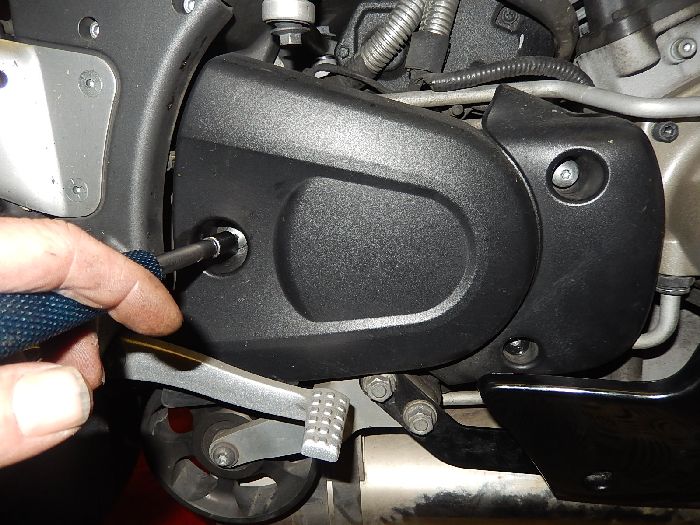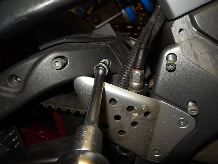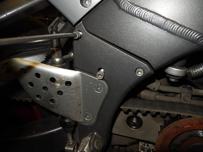 Loosen the foot peg mount plate, in case off a Ullysses with side case rack you will need to loosen the screw to the side case rack to