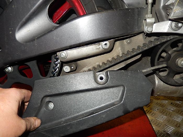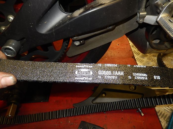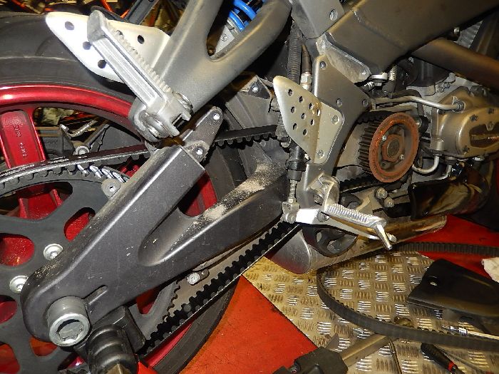 Now it is very useful to have a paddock stand , but the belt can be changed with the wheel on the ground , in this case off a belt replacement, as the belt was cracked , take  the old belt off