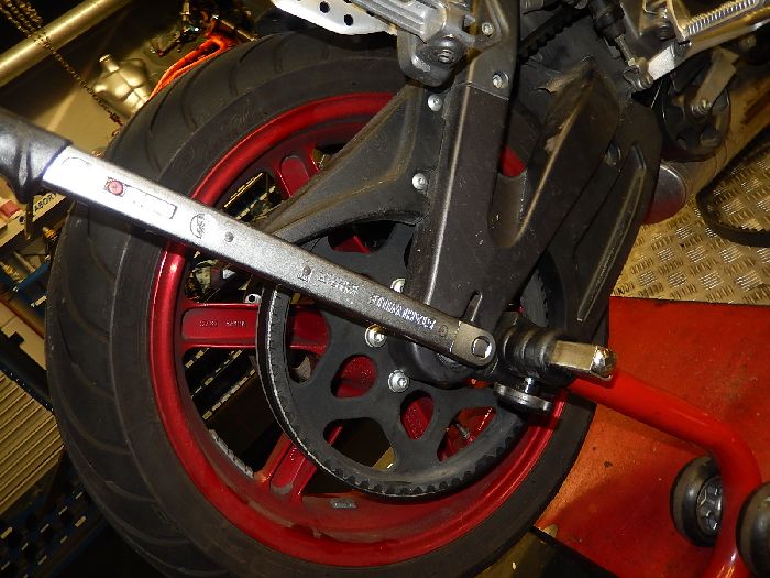 Now tighten the rear axle, I like to by turn the wheel forward while doing so. to line up the belt ,  Tighten to 35 NM, loosen 2 full turns and retighten the axle to 66NM