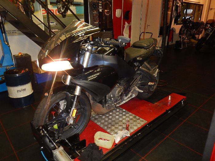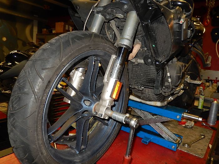 Big service 1125R, oil changed on the front forks, new front wheel bearings , ready to go back in.