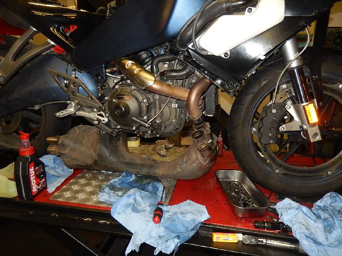 Big service 1125R, exhaust off , bike turned around to have more work space.