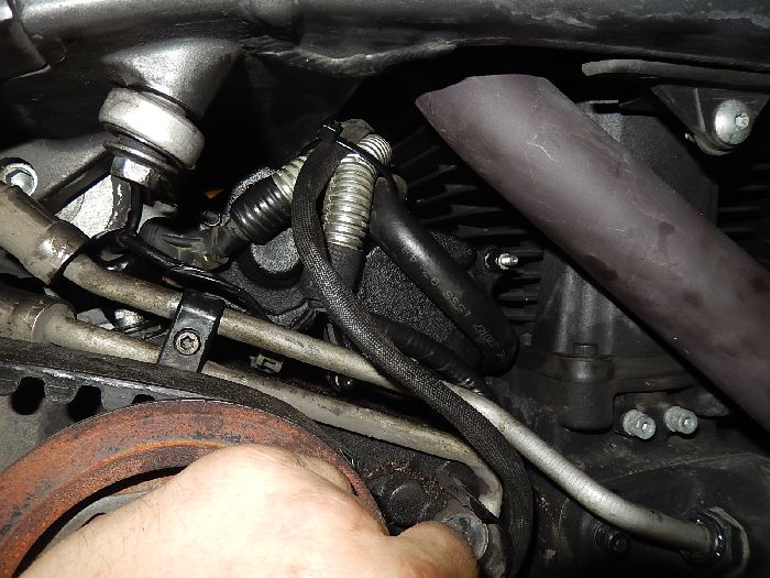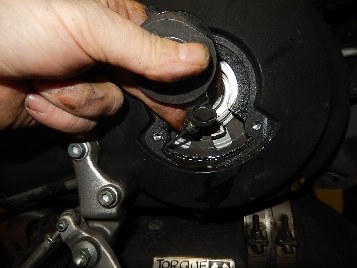XB12X , take the c-clip out off the fitting, and pull the oil line out and out off the way, as this a breather line, normaly there will be oil spill.