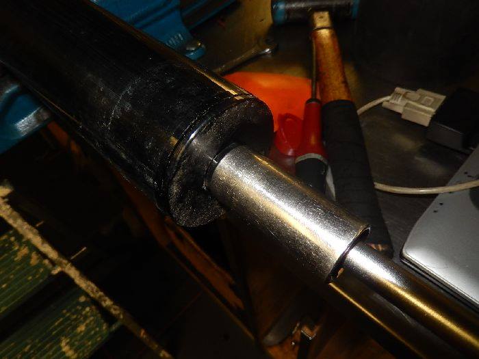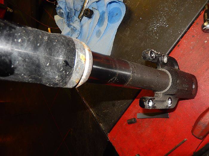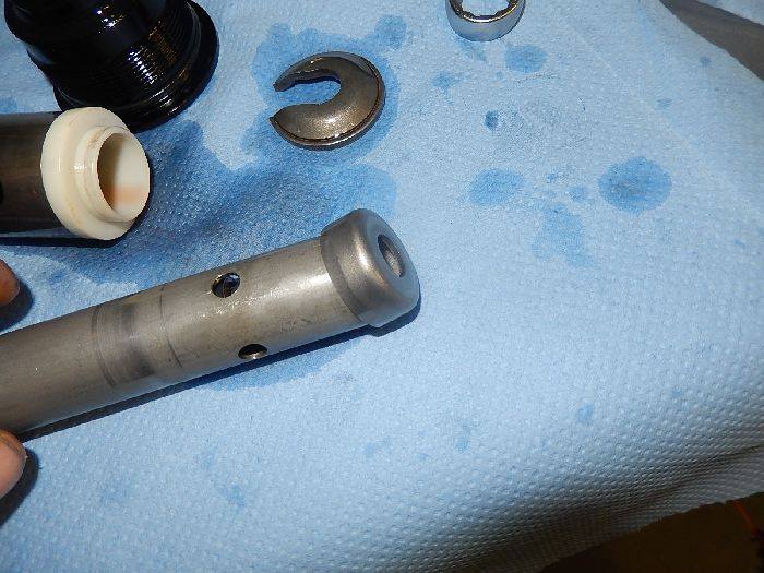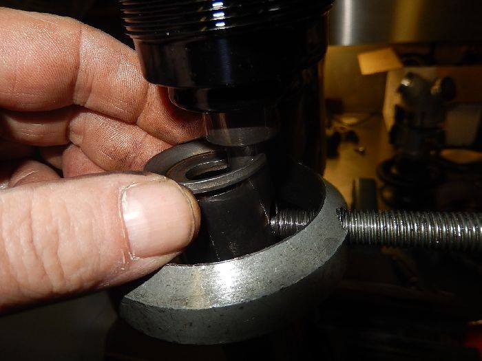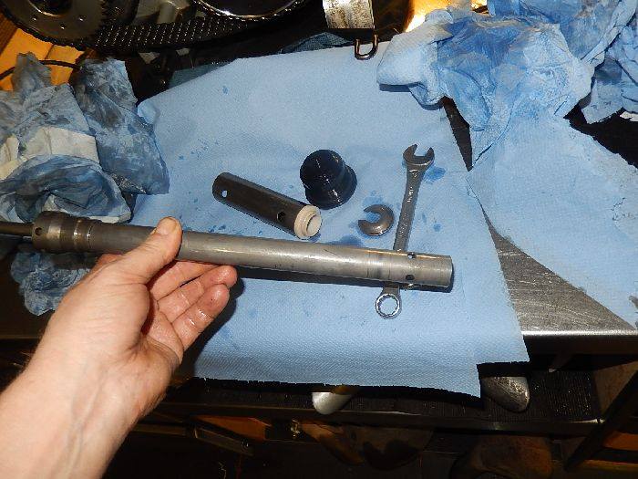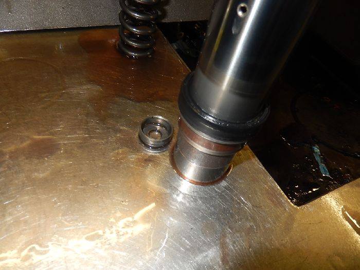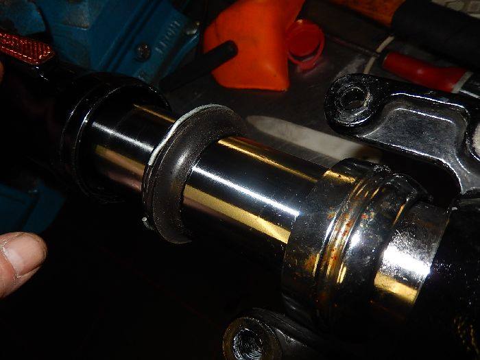 XR1200 repairs, sliding the outer and inner tube using theme as a slide hammer and tap the oil seal out , you see the loose cup that is on the bottom off the damper.