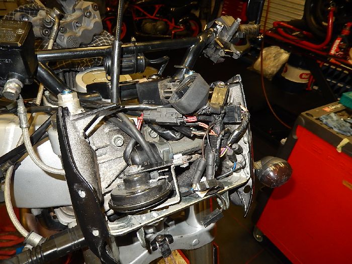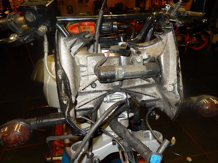 Xb9Sx service, speedo out, and electrics disconnected , remove the steering lock with a security bit , and the 2 head light side panels come off.