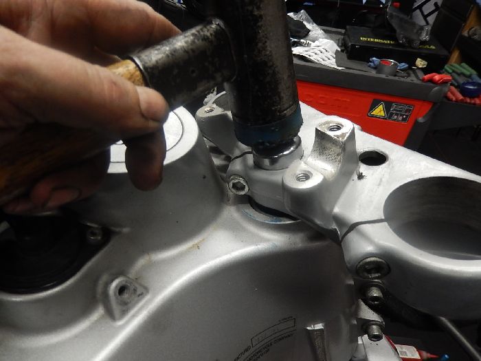 Xb service, there are notches in the frame for the driver so you can tap these on the outer race , use a heavy hammer to have some mass , better controlled than trying to hit hard with a light hammer.
