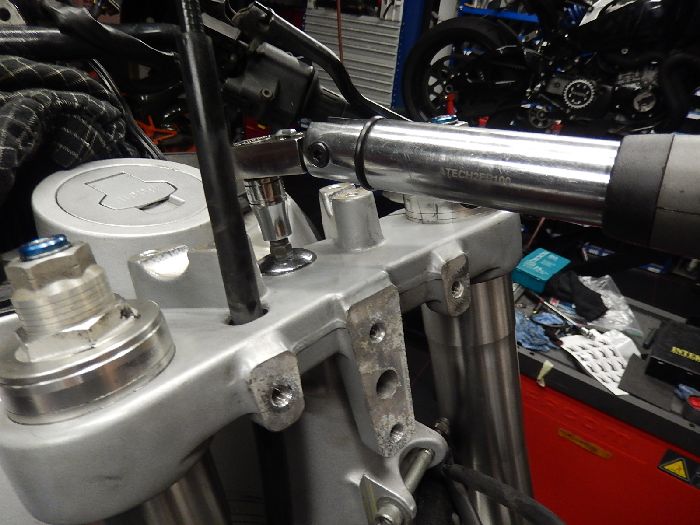 Xb service, now tighten the stem nut to specs 55NM , and tighten the pich bolt , now tighten the lower plate clamps on the front forks.