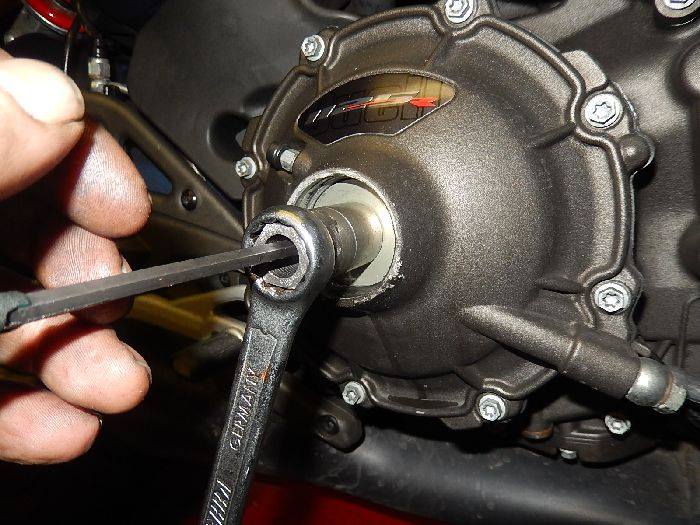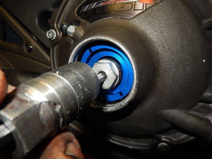 1125R leaking clutch , alle key 5 mm and socket 17 to remove the pulling nut hold the allen key so it will not rotade.