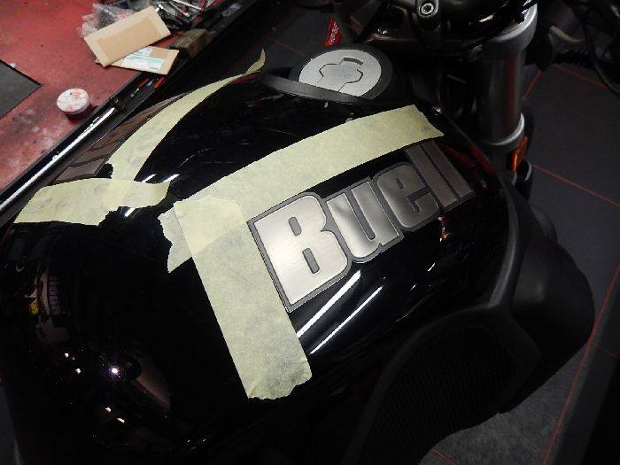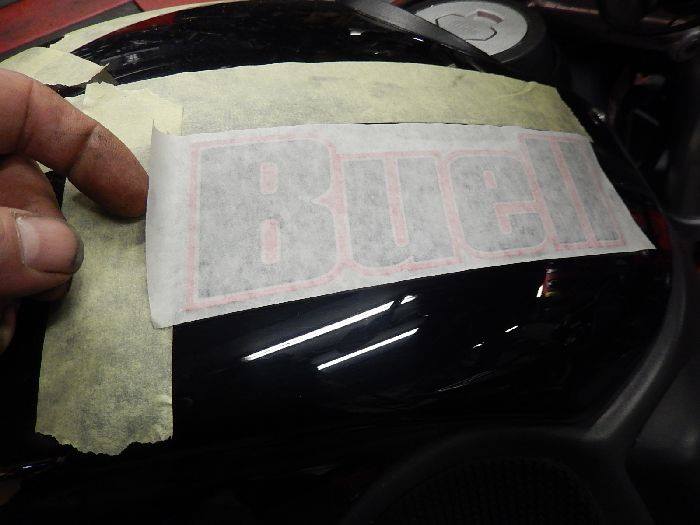 bussy in the shop, customer asked if i would change his decals , lining up with masking tape.