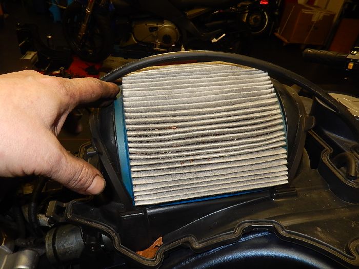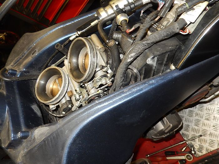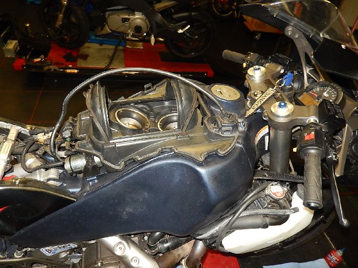 1125R service, base plate airfilter off, becarefull with the 2008 models, fuel line connector is plastic, this gets brittle and can break very easy by mishandeling.