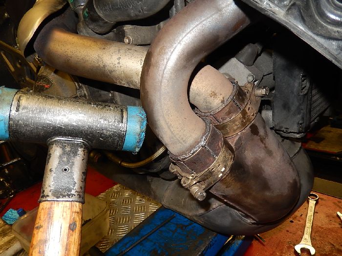 1125R service, exhaust back on, releave the tension in the headers by tapping these before tightening the clamps.