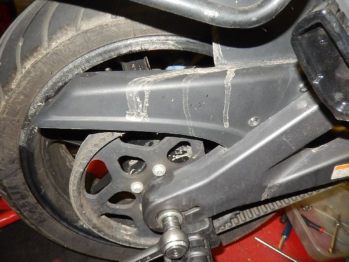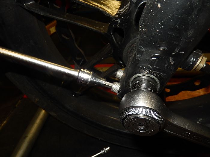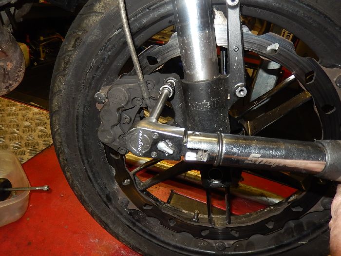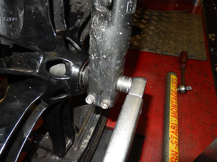 Uly time, carbon upper fender removed, and lower fender off, front end in the support, a swing at the front wheel... yep bearings gone.