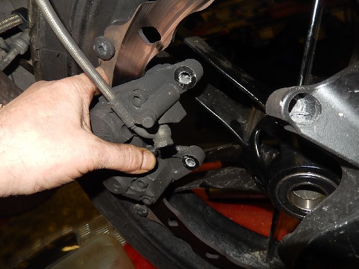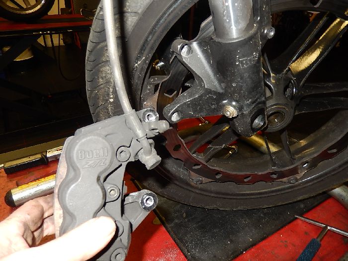 XB9s, with the head off usualy you can remove the left over with your fingers.. blet the system, and brake feels good now.