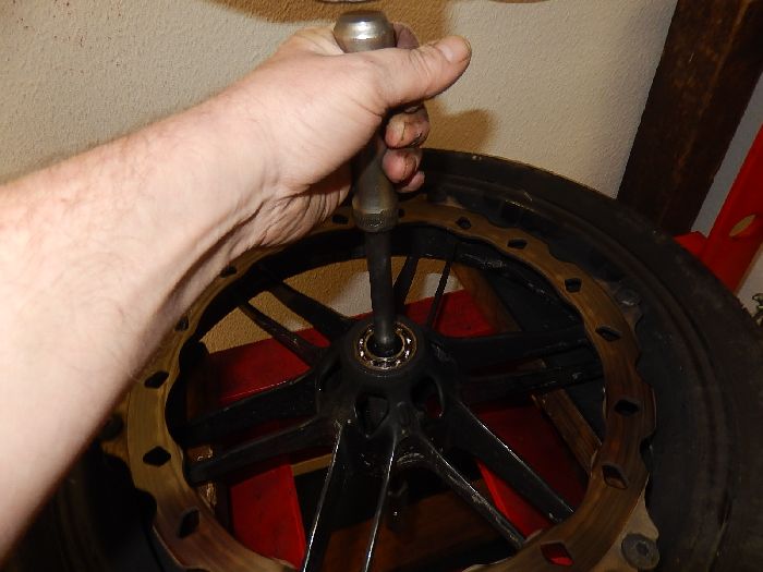 Uly time, press in the disk side first , as the wheel alines to the right front leg , so this bearing needs to be seated to the races , use flat dies to support the inner and outer race.