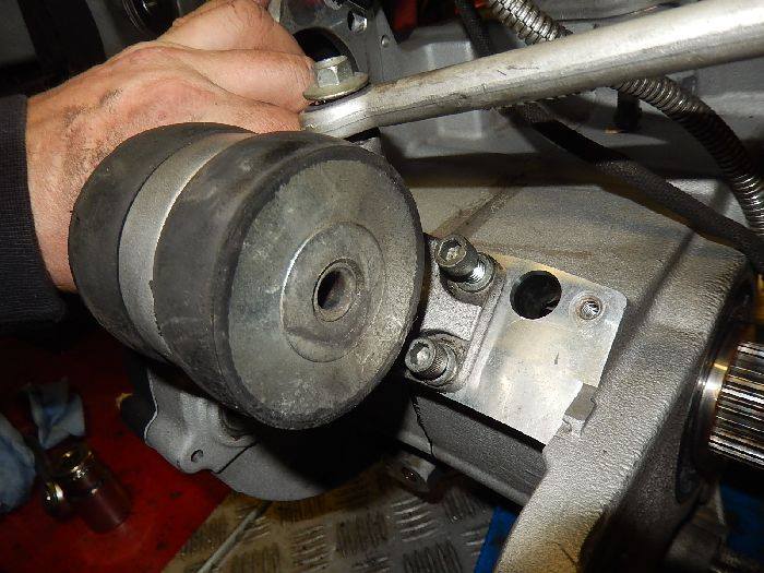 Xb Engine, lifting the engine jack to first attach the rear mount bolt.