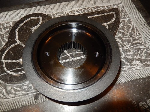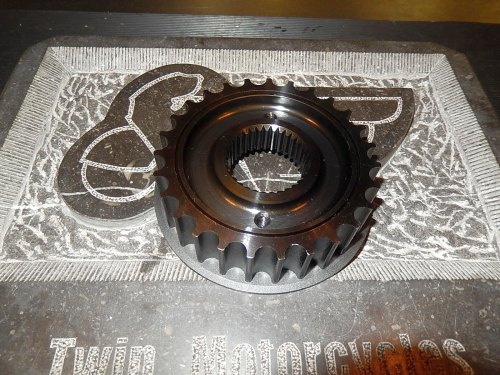 The Twin Motorcycles Steel front pulley 27 tooth. The weight is same as stock only a better quality steel. The outside part is painted black to avoid corrosion.